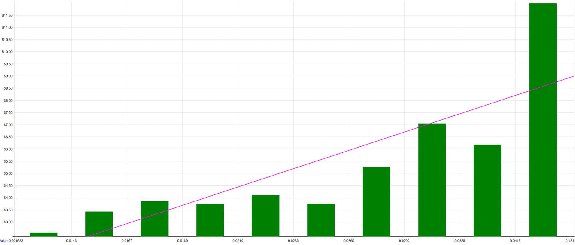 By creating ten buckets based on the normalized ATR and calculating the average profit per trade in each, we obtain the following chart: