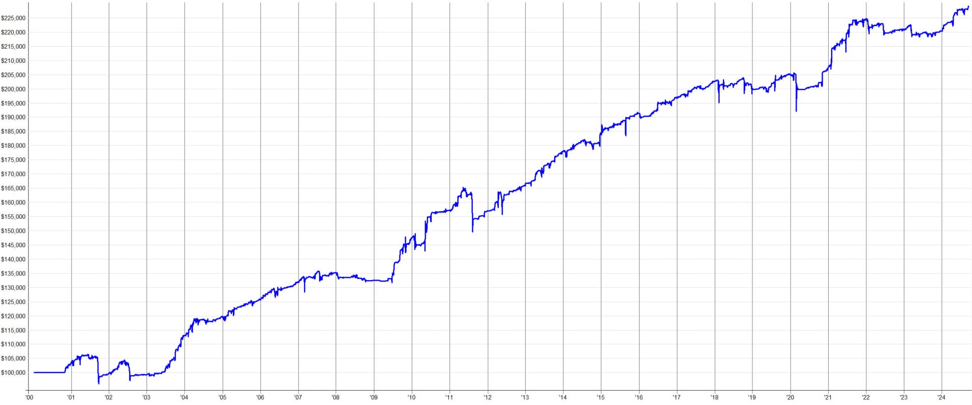 If we invested $1,000 in each trade, then from backtesting since the year 2000, we would have achieved an impressive nearly 25,000 trades. We would have traded with a success rate of 56.81% and a positive risk-reward ratio鈥攖he average profit is higher than the average loss. The equity curve of such a backtest looks as follows: