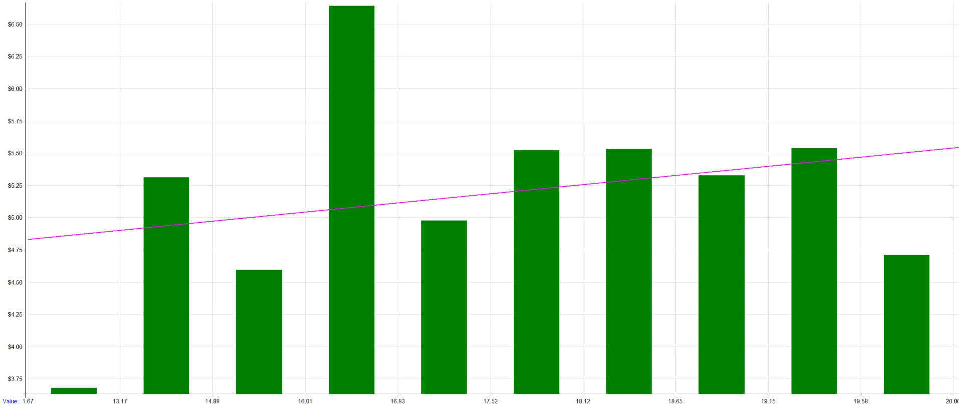 We observe that the dependence of profit per trade on the RSI(5) value is minimal. Therefore, we likely won't improve the strategy significantly by favoring trades with a deeper dip.