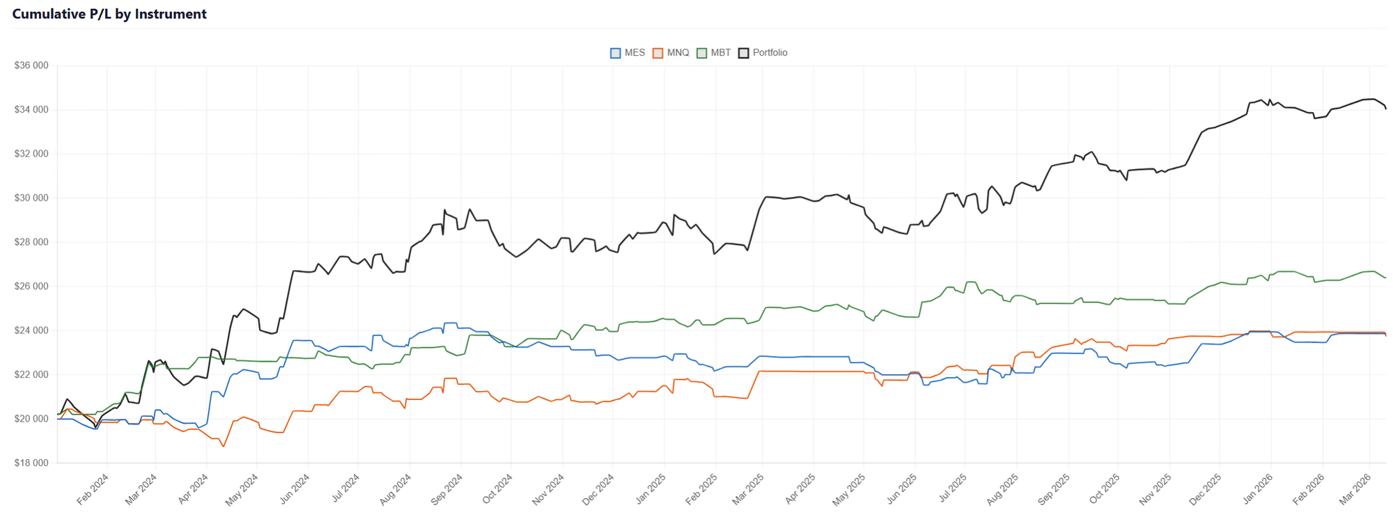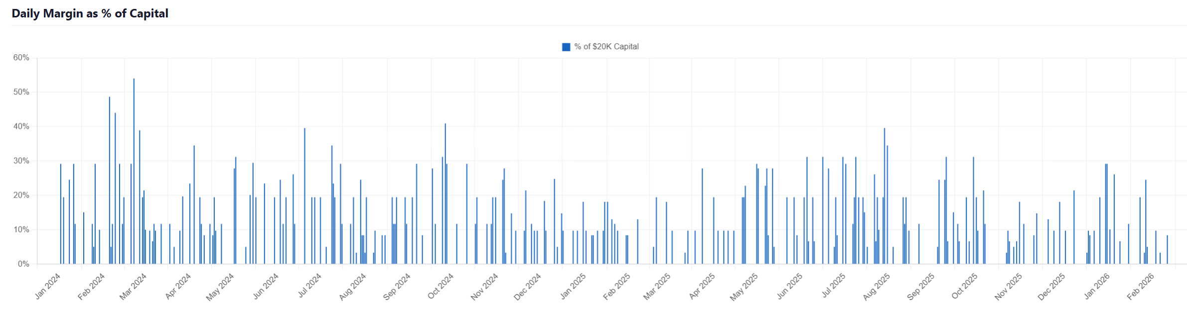 The system integrates well with other strategies in a portfolio. Even with currently elevated intraday futures margin requirements (TradeStation values: MES $667, MNQ $1,012, MBT $1,947), the average capital allocated to margin across all tested trading days is only 16.5%.
