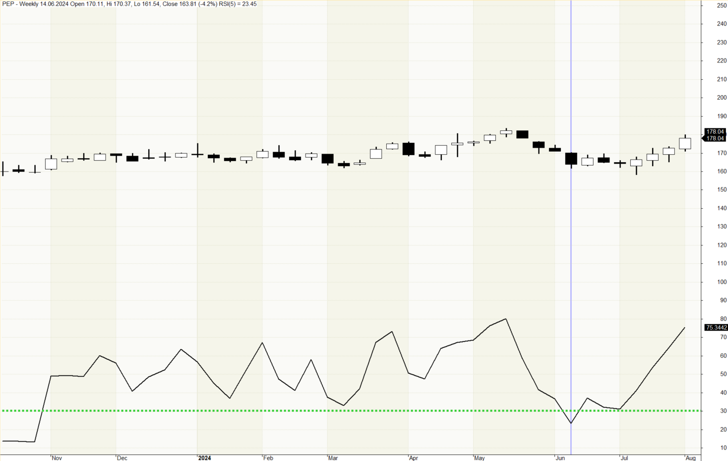 An example of a weekly chart of PEP stock with the RSI indicator calculated over a 5-day period applied. The area where the RSI drops below 30 can signal an attractive buying opportunity.